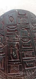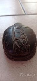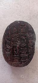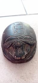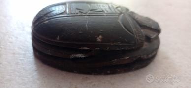 Scarabeo sacro egizio, un potente amuleto apotropaico che simboleggiava l'eterna rinascita, il rinnovamento e i cambiamenti felici. Significato:Associato al dio Khepri (dio del sole nascente), rappresentava il ciclo solare e la vita oltre la morte. Uso:Poteva essere indossato dai vivi come sigillo protettivo o posto sul petto delle mummie come "scarabeo del cuore" per proteggere il defunto durante il giudizio finale. Materiali:Comuni erano la steatite, la pasta vitrea e pietre come il calcedonio, spesso di colore nero o verde. Dettagli:Il lato inferiore recava spesso iscrizioni geroglifiche o formule tratte dal Libro dei Morti. misure lunghezza 9,5cm larghezza 7cm