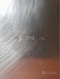 La punzonatura con il semplice 800 indica una produzione antecedente la legge 5/2/1934 n. 305, che introdusse l’ovale intorno al titolo dei millesimi oltre alla forma a losanga con numero identificativo del gioielliere e sigla della provincia divisi dal fascio littorio. Le due punzonature laterali sembrano indicare solo una sigla identificativa che, anche ingrandita, resta non leggibile.