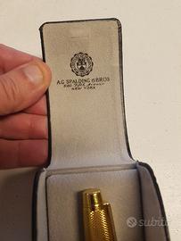 Scatola originale A.G. Spalding & Bros (New York) Vintage in condizioni come da foto con Penna a sfera con corpo dorato (funzionante perfettamente), completa di 6 refill neri. La scatola è marchiata Spalding originale; La penna non riporta marchi visibili e quindi viene proposta come accessorio (può essere OEM / coeva - può essere fornita come accessorio in boutique - può essere non prodotta direttamente da Spalding). Oggetto vintage da collezione o scrittura, condizioni come da foto. Vendita non professionale di oggetti nuovi non utilizzati, usati o vintage. Le foto sono parte essenziale dell’inserzione e rappresentano lo stato reale degli oggetti.