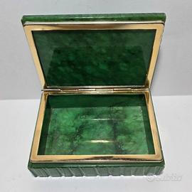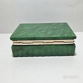 Scatola in alabastro verde realizzata dalle botteghe di Volterra, manifattura molto simile alle produzioni della bottega di Romano Bianchi, risalente agli anni '60 e '70 del '900. Presente etichetta nel sotto. Si puoʻ utilizzare come porta gioie.