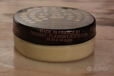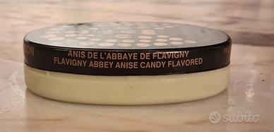 Iconica scatolina ovale di Anis de l'Abbaye de Flavigny, le celebri caramelle francesi prodotte in Borgogna fin dal 1591. Questo esemplare risale circa agli anni '80/'90, caratterizzato dalla tipica base in plastica color crema e coperchio in metallo litografato. Il design del coperchio celebra i prestigiosi premi vinti dall'azienda nelle Esposizioni Universali (Parigi 1867, 1900, ecc.). Dimensioni: 8,5 x 5,5 x 2,5 cm.