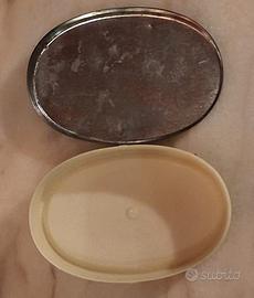 Iconica scatolina ovale di Anis de l'Abbaye de Flavigny, le celebri caramelle francesi prodotte in Borgogna fin dal 1591. Questo esemplare risale circa agli anni '80/'90, caratterizzato dalla tipica base in plastica color crema e coperchio in metallo litografato. Il design del coperchio celebra i prestigiosi premi vinti dall'azienda nelle Esposizioni Universali (Parigi 1867, 1900, ecc.). Dimensioni: 8,5 x 5,5 x 2,5 cm. Condizioni: La litografia esterna è ben conservata con colori vividi. Presenta segni del tempo e naturale ossidazione all'interno del coperchio metallico (come visibile in foto), che ne attestano l'originalità e l'epoca. Curiosità: Il marchio è diventato leggendario anche grazie al film Chocolat, girato proprio nel borgo di Flavigny. Perfetta per collezionisti di oggettistica pubblicitaria, scatole di latta (tin box) o per decorazione in stile Shabby Chic e cucina vintage. #vintage #scatoladilatta #anisdeflavigny #collezionismo #madeinfrance #pubblicitario #tinbox #shabbychic #modernariato #caramelle #oggettisticavintage #borgogna #latta #militaria #vintagefrancese