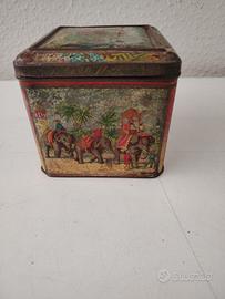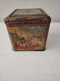 scatola di latta anticada collezione, caratterizzata da decorazioni in stile orientale o cinese sul coperchio e sui lati.