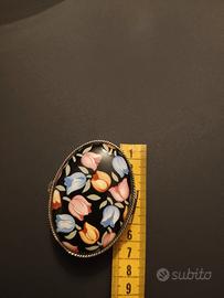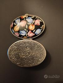 Bellissima scatola in argento lavorato(800 o 925) nn riesco a decifrarlo, con coperchio in ceramica decorato fiori tulipani. Tutto visibile in foto. Era in casa dei nonni.