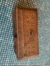 È scolpita a mano con intricati motivi geometrici e floreali, tipici dell'arte popolare, utilizzata per conservare gioielli della dote nuziale in alcune culture, presenta un design rustico e un fermo in metallo.
