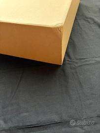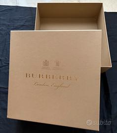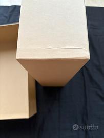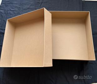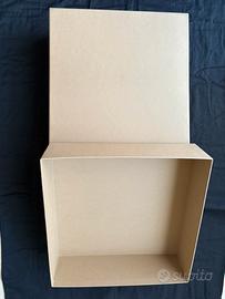 In cartone color tortora Logo dorato in sovrimpressione al centro Dimensioni elemento superiore 36x36x10 Inferiore 35,5x35,5x 13 Condizioni molto buone Ammaccatura di un angolo elemento inferiore come da foto Piegatura della carta in un punto dell’elemento superiore come da foto