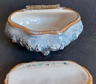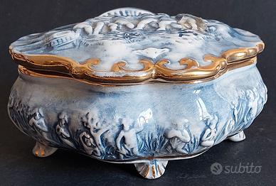 Capodimonte, Scatola polilobata in ceramica a rilievo con putti, XX sec. profilata in oro, reca marchio manifattura M.A.S. di Capodimonte Italy sotto la base, H cm 7.5x 14x10.5. come si vede dalle foto è da sistemare in quanto il coperchio è svitato. per questo motivo la vendo a pochissimo. il danneggiato si riferisce al fatto che il coperchio deve essere avvitato, non essendo pratico non lo faccio.