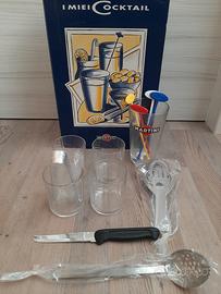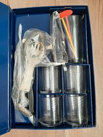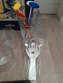 Scatola contenente diversi accessori per realizzare cocktail. Ogni elemento (tranne i 4 bicchieri) è brandizzato Martini. Dimensioni 25x37 cm.