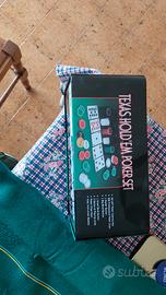 scatola con fiches di 5 colori nero blu verde bianco e rosso con 1 dealer 2 mazzi di carte nuove 1 big blidn e 1 small blidn più un telo texano nuovo mai utilizzata tutto nuovo