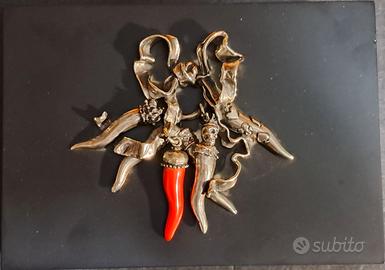 Scatola in legno laccato nero opaco porta carte da gioco. Sulla parte frontale è applicato un suggestivo decoro in Bronzobianco che raffigura un intreccio di corni portafortuna, scolpiti con grande cura nei dettagli e rifiniti con una patina lucida che ne esalta le forme. Tra i corni spicca un elemento in colore rosso acceso, che crea un contrasto vivace e distintivo. Carte da gioco personalizzate Dal Negro incluse.