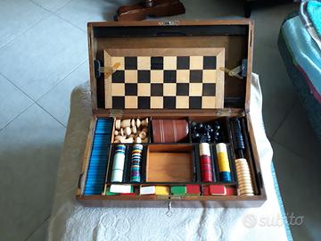 scatola da gioco in legno massello con chiusara a chiave, degli anni 40/50 composta da dadi, bicchiere in cuoio, piatto per dama filetto e scacchi, completo di pedine e fish, più gioco domino.