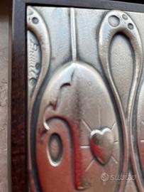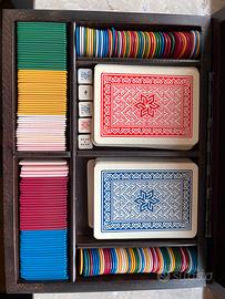 Scatola da gioco marca Brunel, lavorazione artistica in argento del coperchio e legno . All’interno fiches di vari colori e misure e carte da gioco