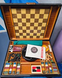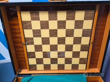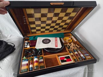 Vendo set da tavolo in ottimo stato marca "Dal Negro" scatola da gioco in radica di palissandro . La scatola è costituita da: scatola in radica di palissandro; scacchiera con pedine dama e scacchi in legno . set roulette russa, con due pallini bianchi e relativo panno di velluto verde; fiches classiche in plastica per roulette; pedine gioco dama.