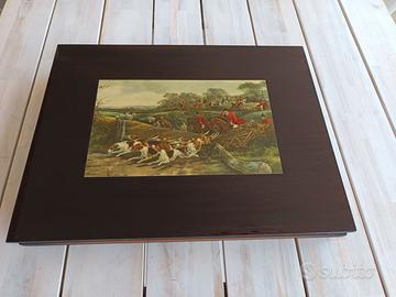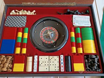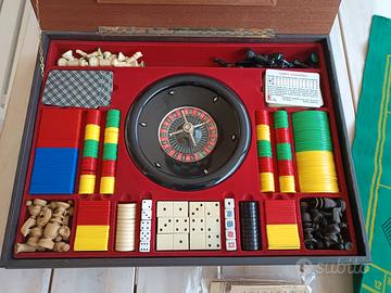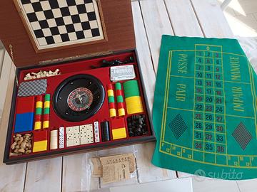 Scatola da gioco vintage in legno laccato dipinto con roulette dadi fiches dama scacchi domino