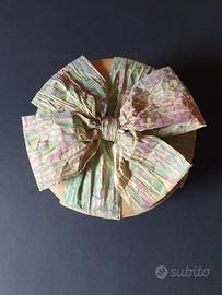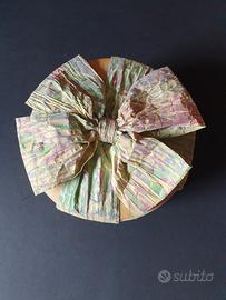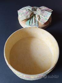 Originale scatola in cartone con coperchio con fiocco in cartapesta, dimensioni diametro cm 12.