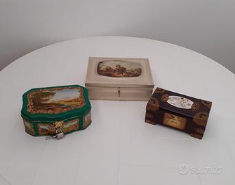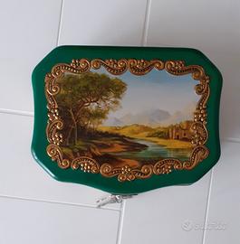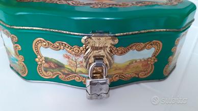 Scatola in latta da collezione degli anni '70 che conteneva caramelle, decorata sul coperchio e lungo i lati con immagini raffiguranti tipici paesaggi settecenteschi incorniciati da greche dorate a rilievo. Ha una chiusura a lucchetto dotato di 2 chiavi, tutto originale. Non ha ammaccature ma il metallo presenta alcuni segni del tempo visibili nelle foto. Misura cm 18 x 15 x 7. Pezzo 2 di 3 della mia collezione.