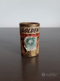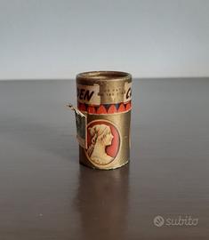 Antica scatola di cartone cilindrica di cerini Golden Cameos con raffigurate 3 immagini classiche di donne (cammei). Contiene ancora 7 cerini. Misure: altezza cm. 4,3 e diametro cm. 2,5. Le foto fanno parte integrante della descrizione.