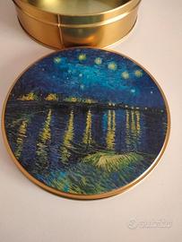 Scatola di latta rotonda, color oro con il dipinto "Notte Stellata" Vincent Van Gogh sul coperchio.