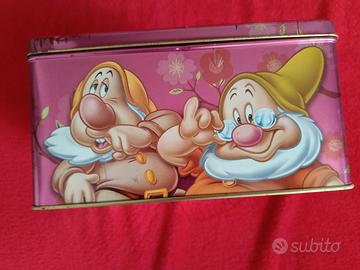 Scatola di latta decorata con i personaggi de I Sette Nani della Disney.