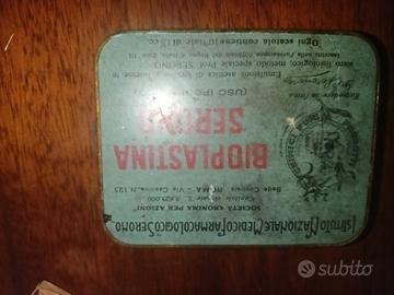 Scatola vuota in latta di bioblastina Serono ( medicinale), stabilimento di Roma, inizi 900 (circa 1920), bandierina italiana con lo stemma della monarchia e sul retro il divieto di esportazione dal Regno d'Italia . ottime condizioni considerata l' età.
