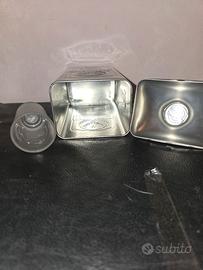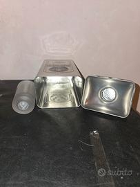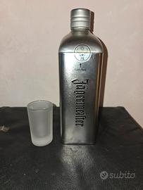 Scatola di latta Jagermeister vintage color argento con bicchiere Jagermeister da freezer.