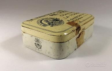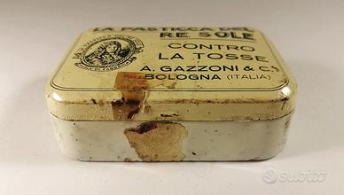 Scatola in latta Pasticca del Re Sole degli anni ‘30 ,cm.9 x 6.5.Condizioni esattamente come da immagini on tracce del sigillo in carta..Vendo a €.15 + spedizione.Difficolta’ nell’apertura e non forzato per non danneggiarla.