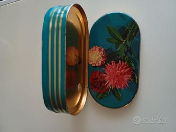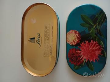 Scatola di latta per caramelle Sirca - prodotta in Italia (Valle d'Aosta) negli anni 50/60 - coperchio con motivo floreale, interno color oro - dimensioni 22x11