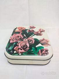 Condizioni: internamente e sotto la scatola ha segni di ossidazione e del tempo. esternamente presenta alcune graffiature da usura e una piccola ammaccatura in un angolo.L'immagine delle rose è integra