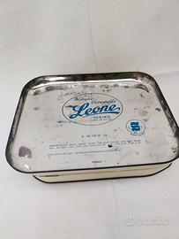 Internamente sul coperchio è stampata la scritta "Pastiglie caramelle Leone Torino" e altre indicazioni di ingredienti e peso netto e una "S" con indicazione marchio esclusivo.