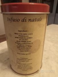 scatola di latta vintage decorativa, conteneva un infuso di natale, coperchio rosso interno perfetto cm 14 diametro cm 8,5
