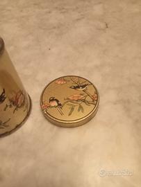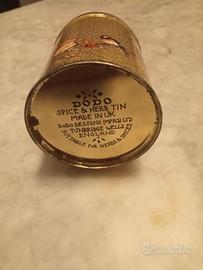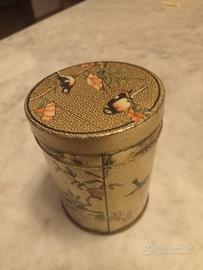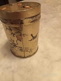 contenitore di latta vintage marca Dodo cm 8x6 design con motivi ispirati allo stile orientale con uccelli e rami, usura dovuta all' età del prodotto