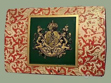 Presenta decorazioni (in rilievo sul coperchio) con al centro raffigurato su sfondo verde uno stemma nobiliare con il motto bulgaro "Съединението прави силата" (L'unione fa la forza).
