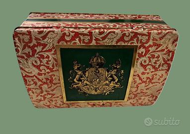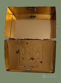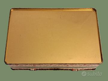 Scatola di latta vintage degli anni 60 contenente probabilmente caramelle assortite, a base rettangolare con coperchio apribile.