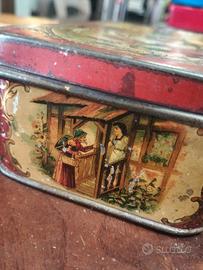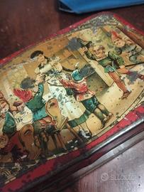scatola di latta vintage, identificabile come un prodotto da collezione che probabilmente conteneva biscotti, decorata con scene del classico Disney