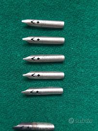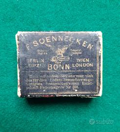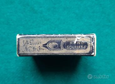 Scatola di pennini F. Soennecken con scritte: Bonn Berlin Leipzig Wien London Rundschrift -F ¼ Gros Nr. 1- 6 contenente pennini vari Soennecken, Legnani, Penna Gloria 400/4, Presbitero . Le foto fanno parte integrante della descrizione. Misure scatola cm. 5,3 x 4 x 1,2