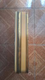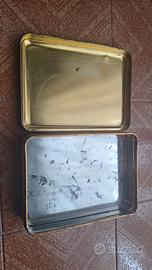 Scatola in latta della Dufour. Forma rettangolare, angoli arrotondati. Colore oro, con scena bucolica su coperchio (dama con pecore e cane, come da foto). In buone condizioni, presente qualche graffio e segno del tempo. Misure: 19x15cm, altezza 5cm. Disponibili molte altre scatole in latta da collezione