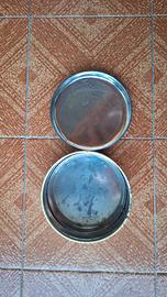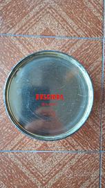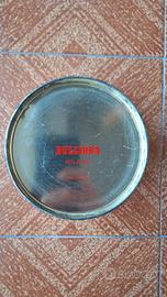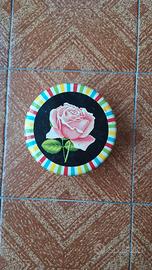 Scatola latta tonda marcata Dulciora - Milano (made in Italy). Modello vintage da collezione, a righe colorate, con disegno fiore su coperchio. Misure: diametro 12cm, altezza 5.5cm. Disponibili molte altre scatole in latta da collezione