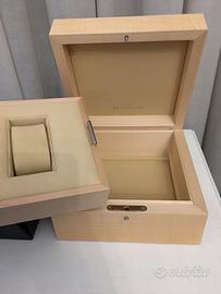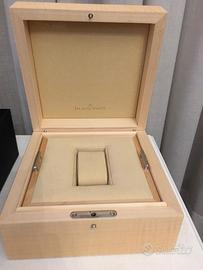 Scatola e contro scatola Blancpain originale, in legno chiaro nuovissima mai usata con libretto di istruzioni. La contro scatola misura 21 × 21 × 15 e la scatola 19,5 × 19,5 × 9,7