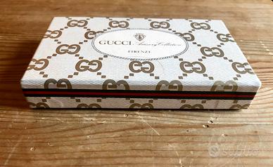 Scatola "Gucci Accessory Collection Firenze", vintage anni 80 in ottime condizioni pari al nuovo, essendo rimasta chiusa in un cassetto per oltre 30 anni. Originariamente conteneva un portachiavi, quindi risulta utile per chi vuole riporre piccoli accessori della stessa linea o per ridare valore a un oggetto vintage che ha perso la sua confezione originale, rendendolo perfetto per una collezione. Misure: 12,5 x 7 x 2