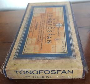 Scatola di cartone Tonofosfan Bayer databile 1947-50 Scatola vuota che conteneva 20 fiale di dimetilammino-metil-fenil-fosfinito-acido di sodio Utilizzato in caso di: esaurimenti, neurastenie, rachitismo, fratture ossee, ecc. Distribuito da Co-Fa Compagnia Farmaceutica di Milano Misure : cm 13.5x8x2 Scatola vuota che presenta segni del tempo: un angolo è scollato, segni di ingiallimento all’interno Condizioni cone da foto