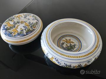 Bellissima scatola in ceramica, di fattura artigianale, decorata con motivi floreali e figure di animali.