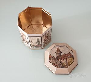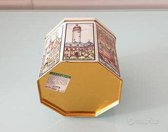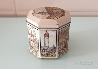 Scatola in latta vuota di caramelle Cedrinca Salò vintage Raffigurante città tedesche: Munchen, Hamburg, Rothenburg, Frankfurt, Heidelberg, Lubeck, Loreley, Nurnberg Dimensioni: cm. 12x12 Condizioni: ottime