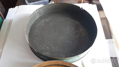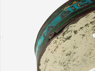Scatola boite tin box in latta per cassata siciliana S. Giovanni Degli Eremiti Descrizione e caratteristiche: Pubblicizza la famosa pasticceria S. Giovanni Degli Eremiti a Palermo. 21 cm (diametro) x 7 cm circa (altezza). Peso: 526 grammi. Primo del 900 e con coperchio originale. Condizioni: Buone condizioni estetiche considerando l'età; ossidazione/ruggine all'esterno/segni di usura, su gran parte della superficie, incluso il fondo. All'interno si notano dei graffietti ma è ben conservato (a differenza del fondo esterno). Sul fronte del coperchio presenti lievi graffi sulla vernice e della ruggine. Si può aprire e chiudere, nonostante alcune lievi ammaccature/leggere deformazioni sulla scatola (lungo il bordo). I caratteri sul fronte non sono più ben visibili data l'ossidazione, quelli lungo il bordo sono ancora abbastanza chiari. Un adesivo sul fondo.