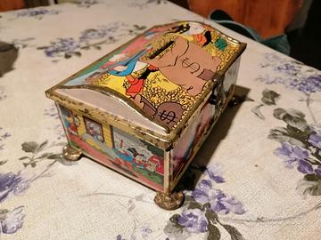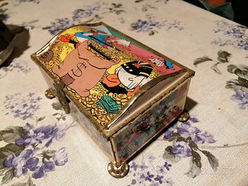 Vendo vecchia scatola in latta con personaggi Disney paperino, zio paperone, ecc...., scatola salvadanaio originale anni 80, buone condizioni, spedizione in tutta Italia