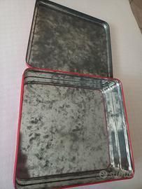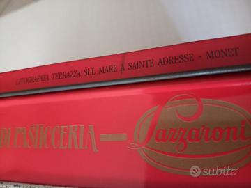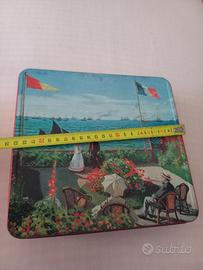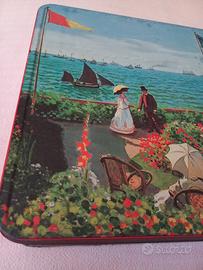 Scatola in latta vintage (riporta la scadenza 07-92) con la litografia del celebre dipinto "La terrazza a Sainte-Adresse" di Claude Monet. Segni del tempo come foto, misure nelle foto.
