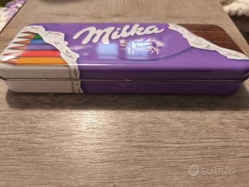Scatola in latta Milka, forma a tavoletta di cioccolato/porta penne.