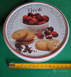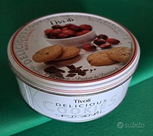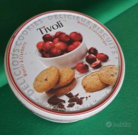 Scatola in latta da collezione. Modello vintage, con diversi segni di usura. Misure: diametro circa 15 cm, altezza circa 7 cm. Colore bianco, con disegno di biscotti e frutta. Pezzo da collezione, adatto come oggetto di decoro o piccolo e pratico contenitore. Disponibili molte altre scatole in latta da collezione.