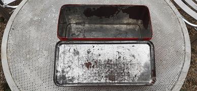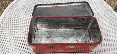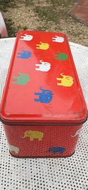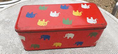 Vendo una scatola vintage a bauletto di latta con elefantini colorati su sfondo rosso.