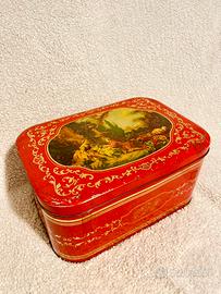 Vendo scatola in latta Sperlari, ideale per collezionisti. Design vintage con decorazioni dorate. Colore rosso vivace. Marchio Sperlari inciso all'interno. Dimensioni: 35x24x17cm