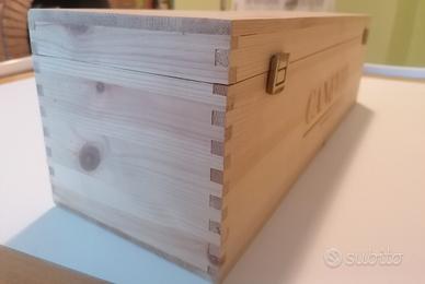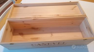 Scatola in legno con cerniere, logo Canevel Spumanti Valdobbiadene, dimensioni 53x16x16 in perfette condizioni